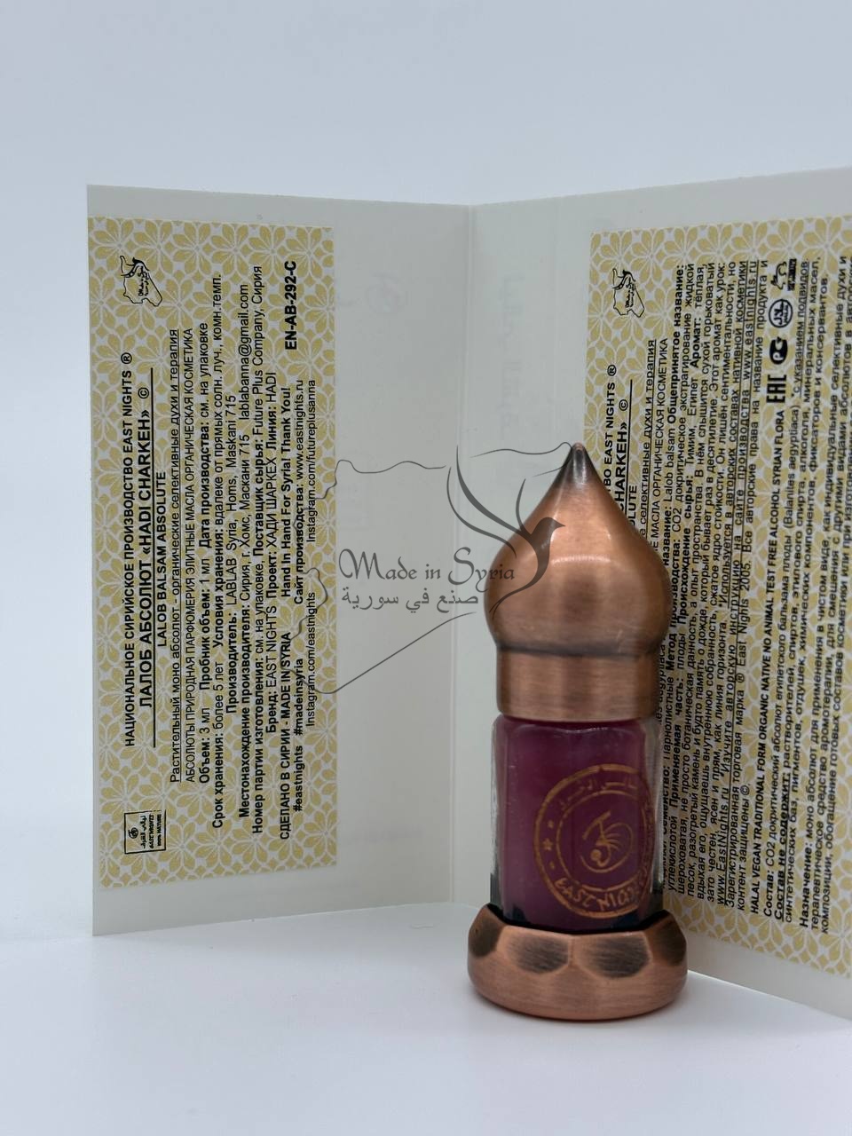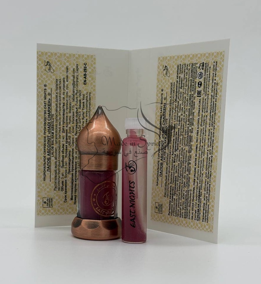 Бренд East Nights Проект Хади Шаркех Линия Hadi Обьем 3 мл. Производство LABLAB Syria, Homs, Maskani 715 Место нахождения производства Сирия, город Хомс, Маскани 715 Страна происхождения сырья Тимим, Египет Поставщик сырья Future Plus Company, Syria, Homs