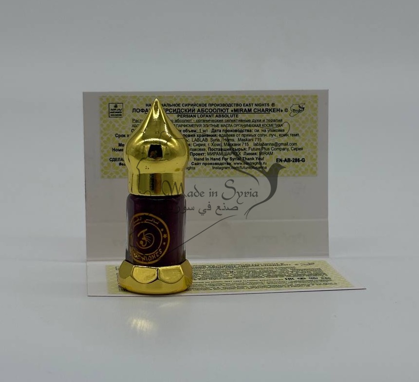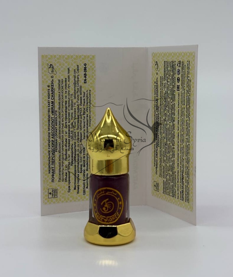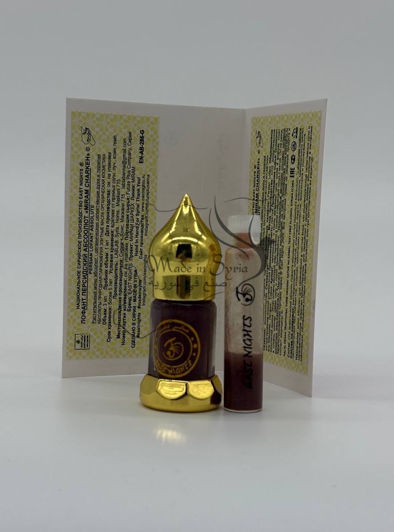 Бренд East Nights Проект East Nights Линия Miram Charkeh Обьем 3 мл. Производство LABLAB Syria, Homs, Maskani 715 Место нахождения производства Сирия, город Хомс, Маскани 715 Страна происхождения сырья Брумманет аль-Машайех, Латакия, Сирия Поставщик сырья Future Plus Company, Syria, Homs