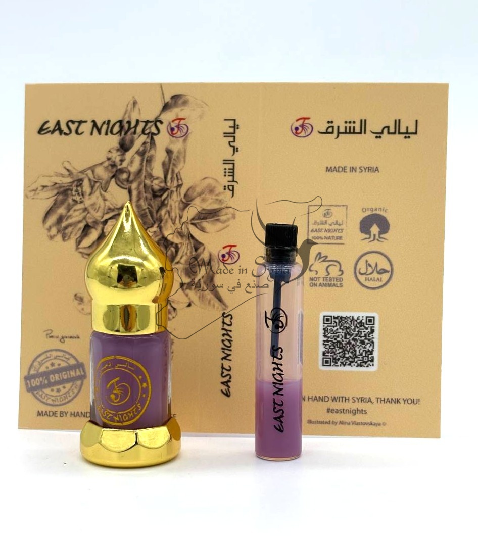 Бренд East Nights Проект Мира Шаркех Линия Mira Charkeh Обьем 3 мл. Производство LABLAB Syria, Homs, Maskani 715 Место нахождения производства Сирия, город Хомс, Маскани 715 Страна происхождения сырья провинция Вади Аль Аюн, регион Латакия, Сирия Поставщик сырья Future Plus Company, Syria, Homs