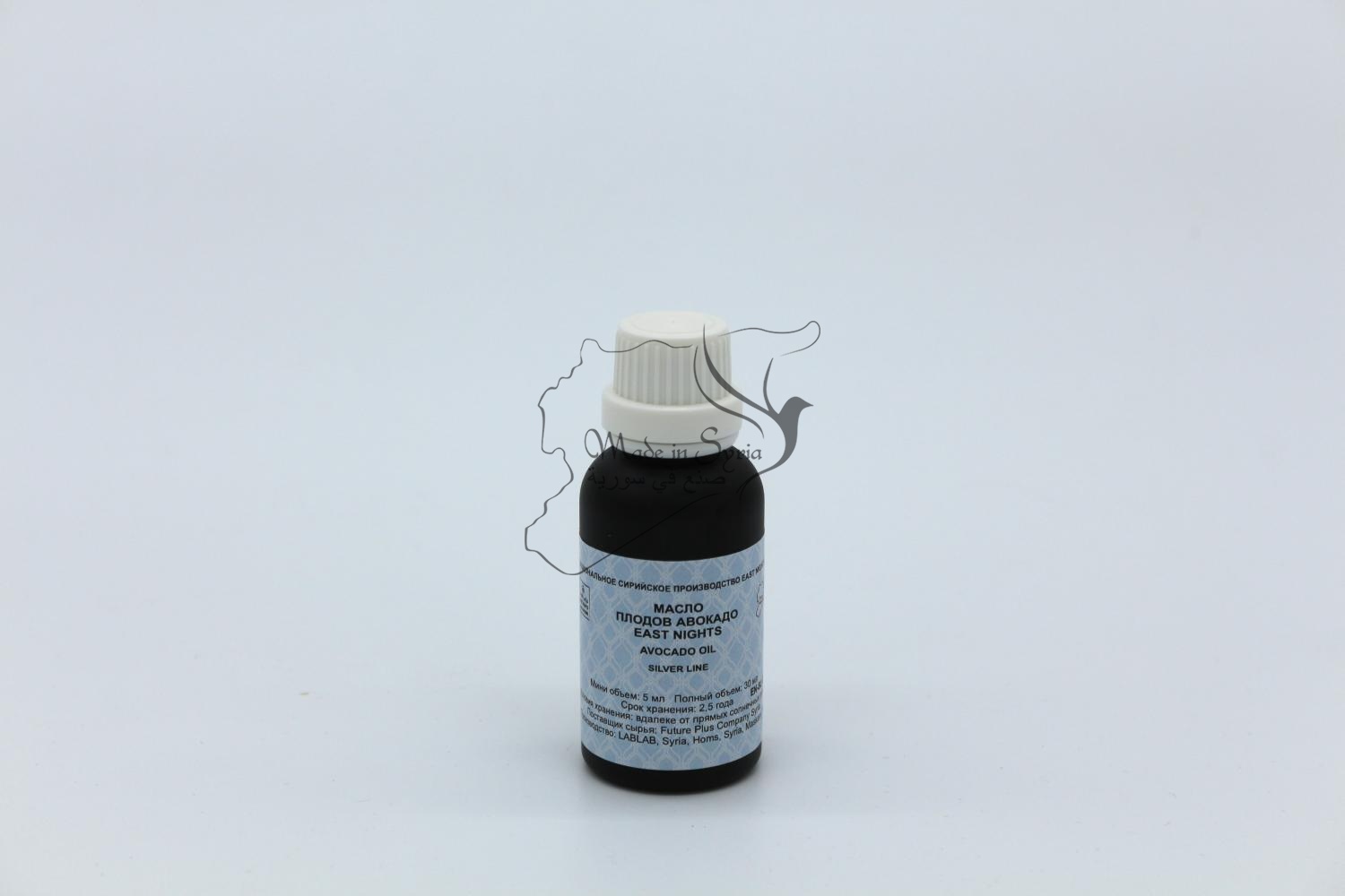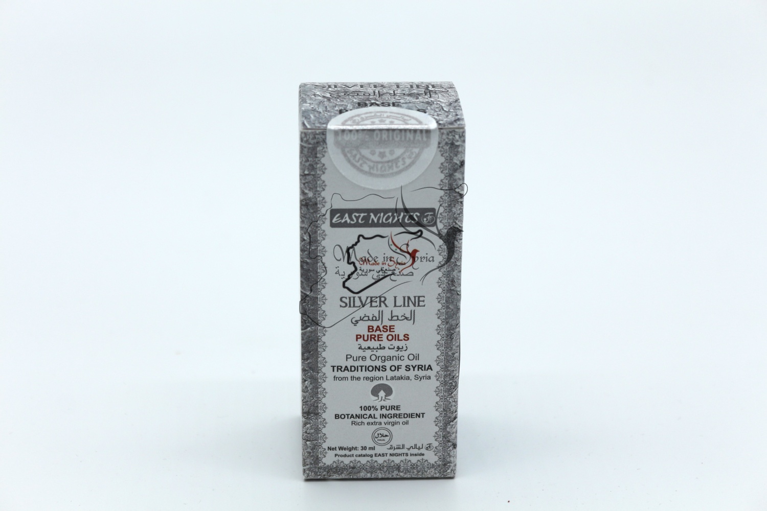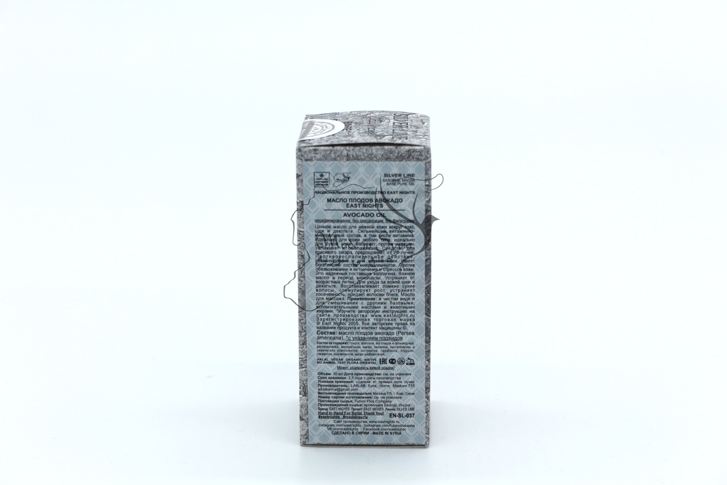 Бренд East Nights Проект East Nights Линия Silver Line Обьем 30 мл. Производство LABLAB Syria, Homs, Maskani 715 Место нахождения производства Сирия, город Хомс, Маскани 715 Страна происхождения сырья провинция Бансур, Индия Поставщик сырья Future Plus Company