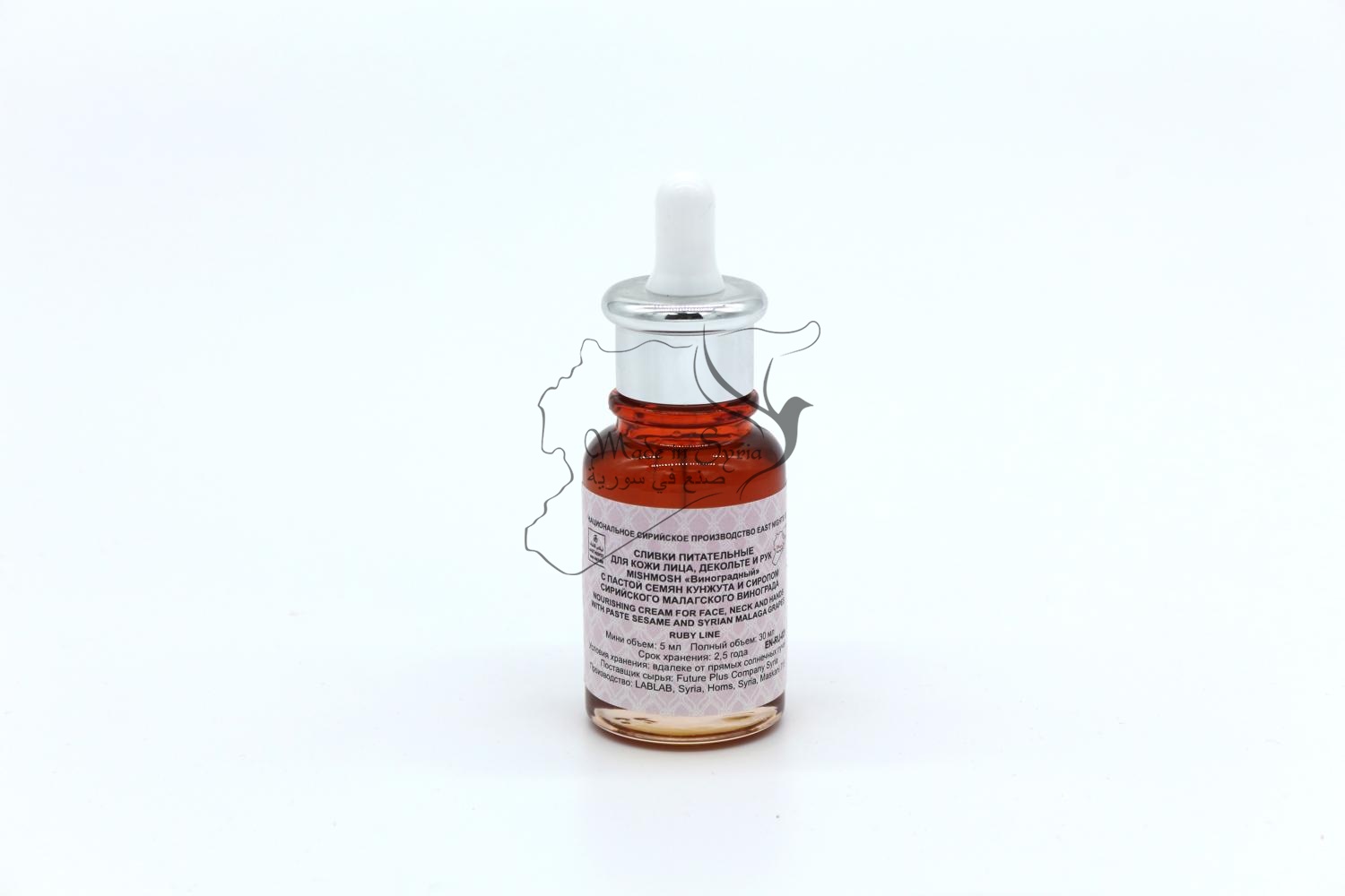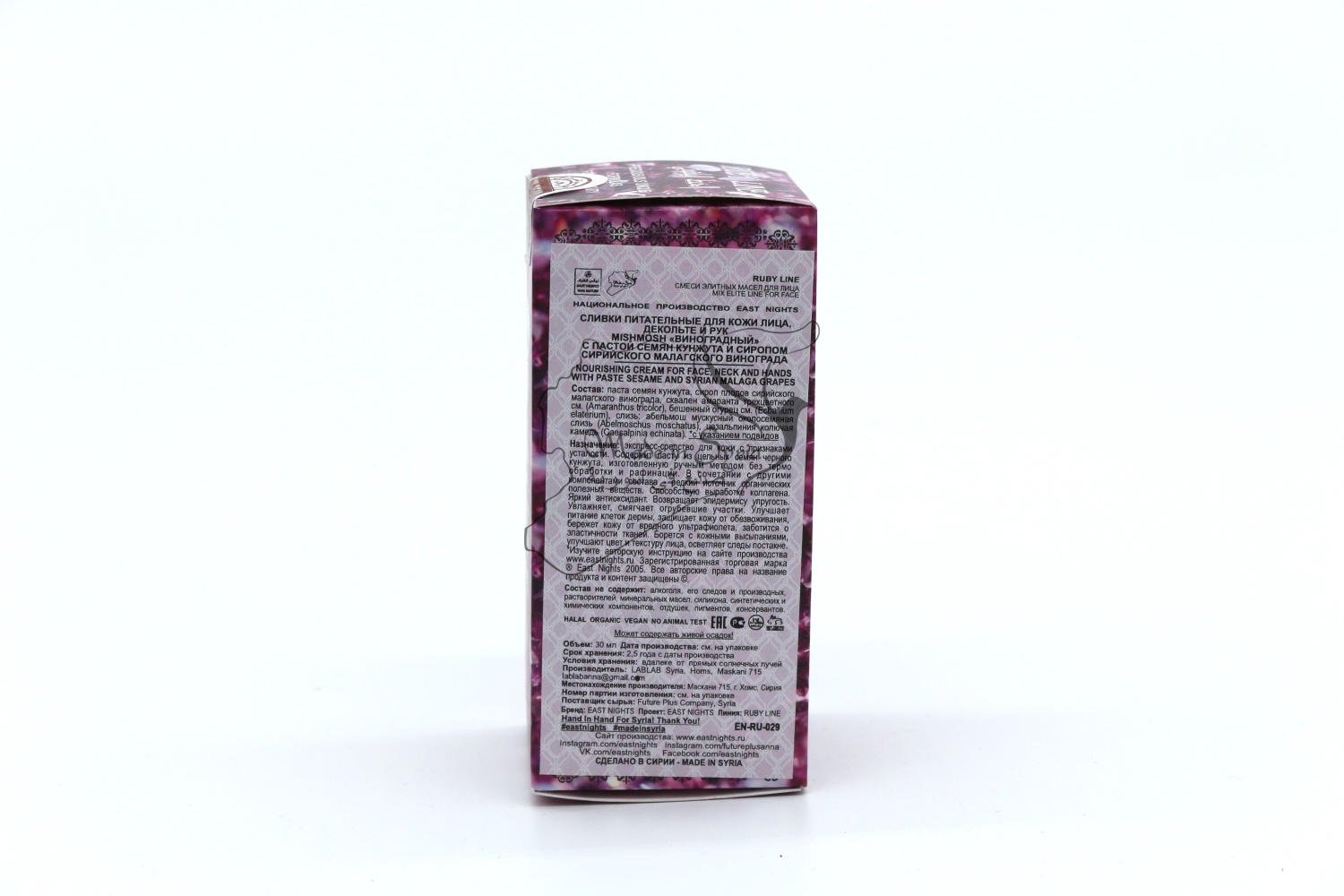 Бренд East Nights Проект EAST NIGHTS Линия RUBY LINE Обьем 30 мл. Производство LABLAB Syria, Homs, Maskani 715 Место нахождения производства Сирия, город Хомс, Маскани 715 Страна происхождения сырья Сирийская Арабская Республика Поставщик сырья Future Plus Company Syria