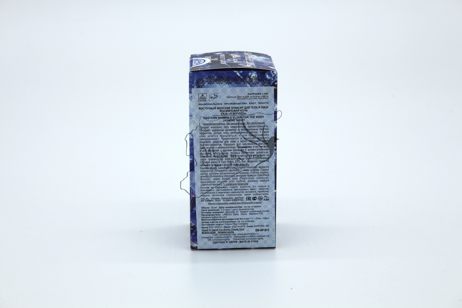 Бренд East Nights Проект East Nights Линия SAPPHIRE LINE Обьем 30 мл. Производство LABLAB Syria, Homs, Maskani 715 Место нахождения производства Сирия, город Хомс, Маскани 715 Поставщик сырья Future Plus Company