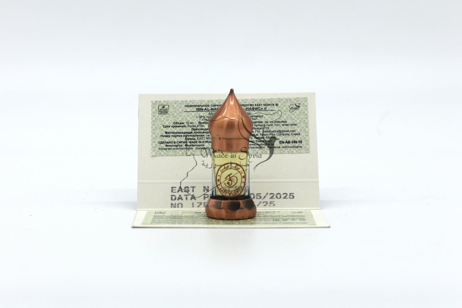 Бренд East Nights Обьем 3 мл. Производство LABLAB Syria, Homs, Maskani 715 Место нахождения производства Сирия, город Хомс, Маскани 715 Поставщик сырья Future Plus Company Syria -