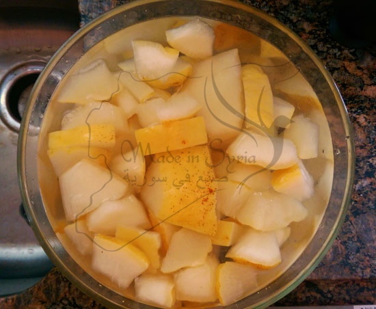 Теперь кипятите их в кастрюле с водой, до тех пор когда белая часть кожуры начнет становиться прозрачной, нужно слить воду, вытащить кусочки и положить их в другую миску. И снова замочить их в теплой воде на несколько часов. Далее вылить эту воду и снова вручную отжимать кусочки от лишней воды.